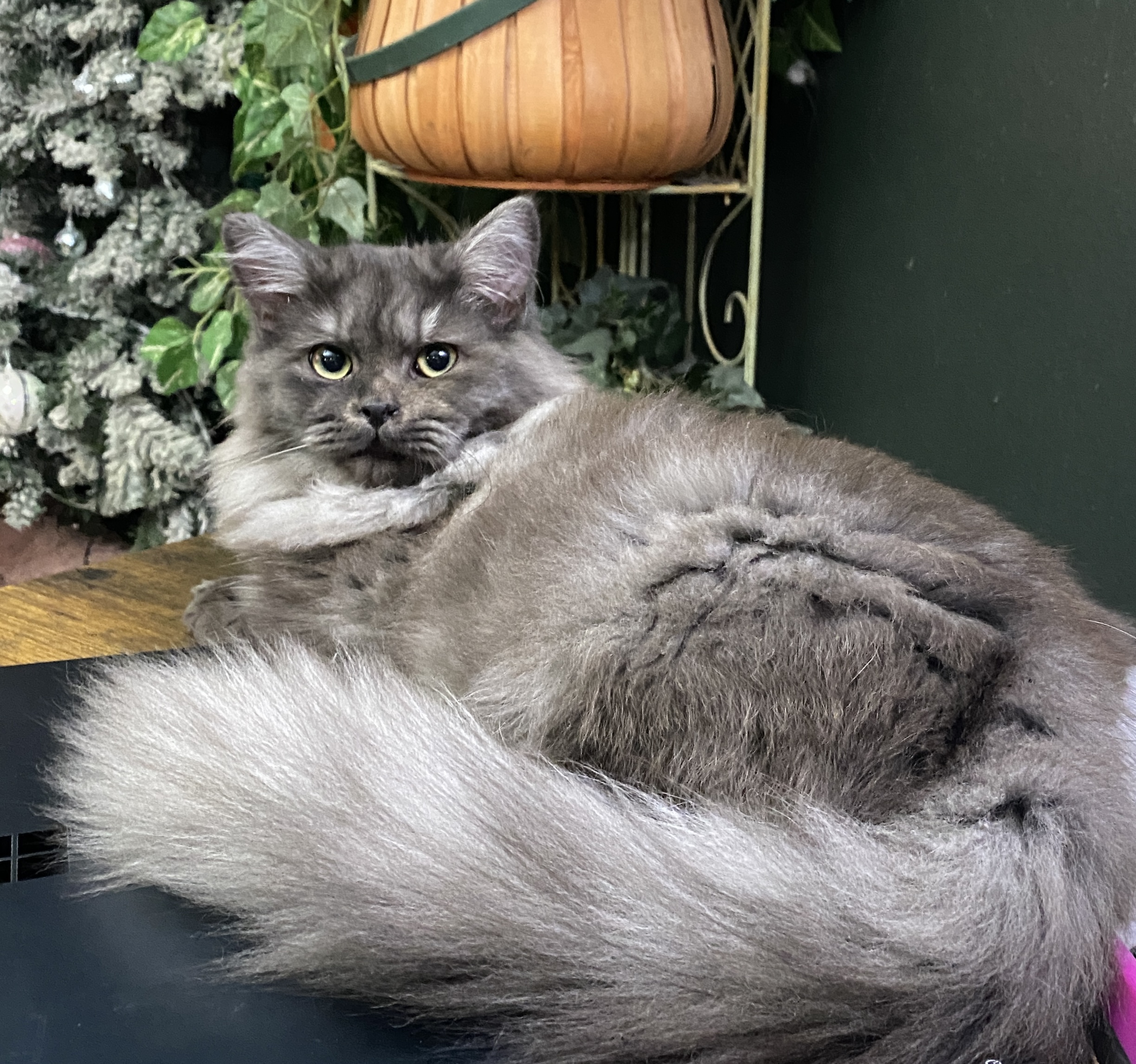 This guy is a big ole fluffy cuddle bug. Smokey is an absolutely gorgeous boy and a real sweetheart. He is just a love and he is a flopper - he flops over on his side to be petted. He wants to be a lap kitty. DOB 7/22/22. Neutered 8/29/24. When company comes over, he is right there insisting on some lovin.